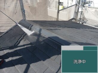 屋根 高圧洗浄中 旧塗膜の粉化や苔、汚れを除去。塗料の密着性を左右するため、時間をかけて丁寧に洗浄します。