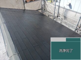 屋根 高圧洗浄完了 洗浄後は屋根材本来の状態が確認でき、劣化箇所の見極めが可能になります。