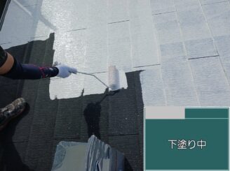 下塗り中 傷んだスレートは吸い込みが強いため、下塗りで素地を固めることが重要。 塗料がただ乗るだけでなく“噛みつく”状態をつくるため、均一に塗布しています。