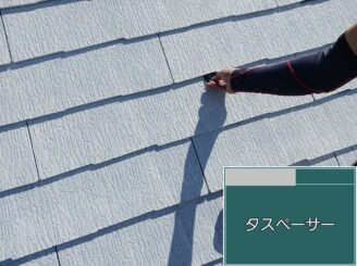 タスペーサ取付け スレート屋根は塗装すると重なり部分が塞がりやすい。 ここを適切に縁切りしないと雨水が内部に滞留し、下地腐食の原因になります。 見えない部分ですが、将来の雨漏りを防ぐための重要工程です。