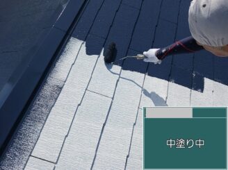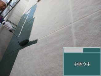 中塗り中 塗膜に厚みを持たせ、紫外線に耐える層を形成。 ただ塗るのではなく、膜厚が均一になるよう確認しながら施工します。