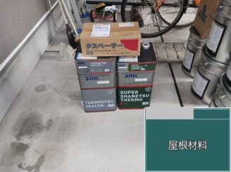 屋根材 今回使用した屋根塗料は、既存スレート屋根の劣化状況を確認したうえで選定しています。 下塗り材で素地を安定させたあと、耐候性に優れた上塗り材を重ねることで、紫外線や雨水から屋根材を守る構成にしています。 屋根は建物の中で最も過酷な環境にさらされる部分。 そのため、密着性・耐候性・膜厚のバランスを考えた塗料選びを行っています。