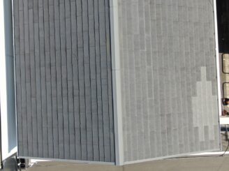 現状 屋根表面は退色が進み、触ると粉が付くチョーキング状態。 塗膜が痩せて防水機能が落ち始めており、放置すれば屋根材自体の劣化につながる段階でした。