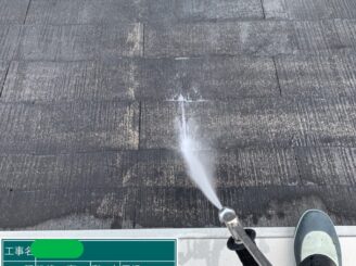 屋根 高圧洗浄中。 屋根表面の汚れ・コケ・旧塗膜をしっかり除去します。