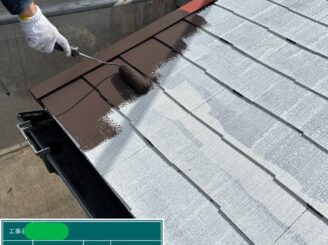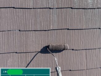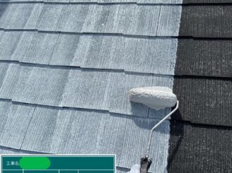 屋根 上塗り中。 仕上げ塗装で色ムラのない屋根に整えます。