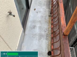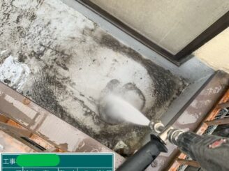 ベランダ高圧洗浄。防水工事前に下地をしっかり洗浄し、密着性を高めます。 ※この工程を丁寧に行うことで、施工後の耐久性が大きく変わります。