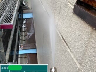 外壁高圧洗浄。外壁に付着した汚れ・カビ・劣化塗膜を高圧洗浄で除去。
