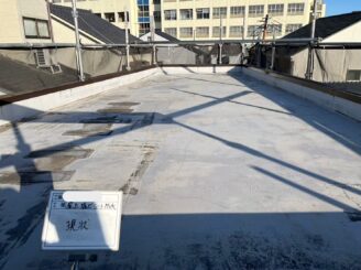 施工前現況。屋上には防水層の膨れが複数箇所見られ、 雨水が内部に侵入している状態でした。