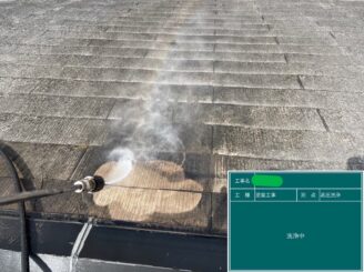 屋根 高圧洗浄中。 屋根表面の汚れや旧塗膜を除去し、塗装前の下地を整えます。