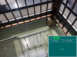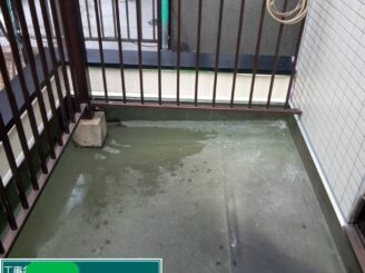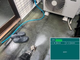 ベランダ 高圧洗浄中。 防水工事前に汚れや劣化粉を除去します。