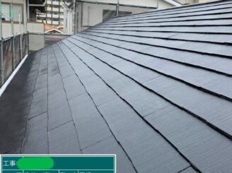 屋根 上塗り中。 仕上げ塗装を行い、屋根を雨風や紫外線から保護します。
