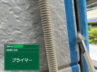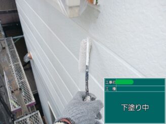 下塗り中(外壁)。 外壁も下塗りが非常に重要です。下地を整え、塗料の密着を高めることで、耐久性のある塗膜に仕上がります。