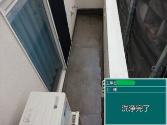 ベランダ高圧洗浄完了。防水材がしっかり定着するよう、下地を整えた状態です。ベランダは雨漏りにつながりやすいので、下準備から丁寧に進めます。