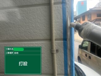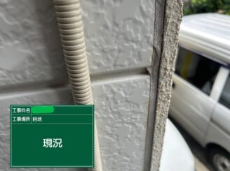 外壁全体に汚れの付着や色あせが見られ、経年変化が進んでいる状態でした。これからの塗装で「見た目」と「保護性能」を同時に回復していきます。