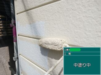 中塗り中(外壁)。 中塗りで塗膜に厚みを持たせ、塗料の性能を発揮させます。ローラーの動かし方や塗り継ぎにも注意して施工します。