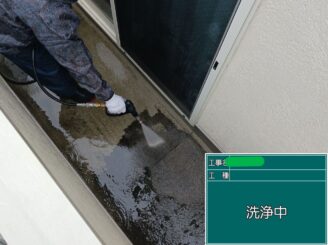 ベランダ高圧洗浄中。ベランダは水が溜まりやすく、汚れやカビが発生しやすい場所です。防水工事前に汚れをしっかり除去して、防水層の密着を高めます。