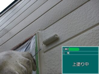 上塗り中(外壁)。 上塗りで最終仕上げです。色ムラを抑え、発色・質感を整えて、耐候性も高めていきます。