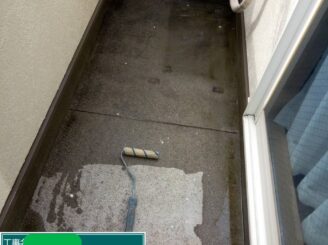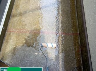 プライマー(ベランダ)。 防水材を密着させるためにプライマーを塗布します。密着不足は剥がれの原因になるため、丁寧に施工します。