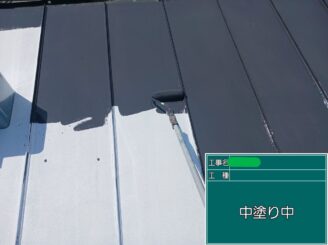 屋根中塗り中 。 中塗りで塗膜の厚みを作り、耐久性を高めます。ムラが出ないよう、一定の厚みを意識して塗り重ねます。