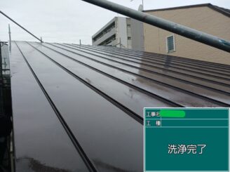 屋根高圧洗浄完了。洗浄後は汚れが取れて、塗装の下準備が整った状態になります。この工程を丁寧に行うほど、仕上がりが長持ちします。