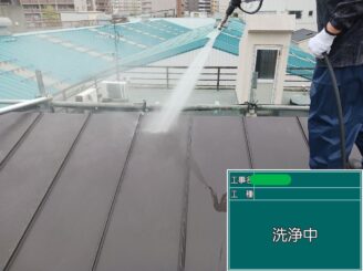 屋根高圧洗浄中。屋根の汚れ・コケ・古い塗膜を高圧洗浄でしっかり落とします。下地をきれいにすることで、塗料の密着が良くなり耐久性が上がります。