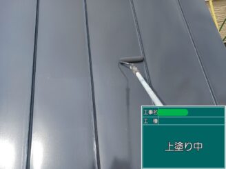 屋根上塗り中。上塗りは仕上げの工程で、見た目と耐候性を決める重要な塗装です。発色とツヤ感が整い、屋根全体が引き締まります。