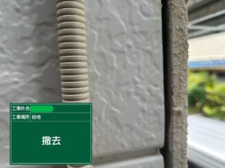 撤去。古いシーリング材を撤去します。ここを中途半端に残すと新しいシーリングの密着が悪くなるため、丁寧に取り除きます。