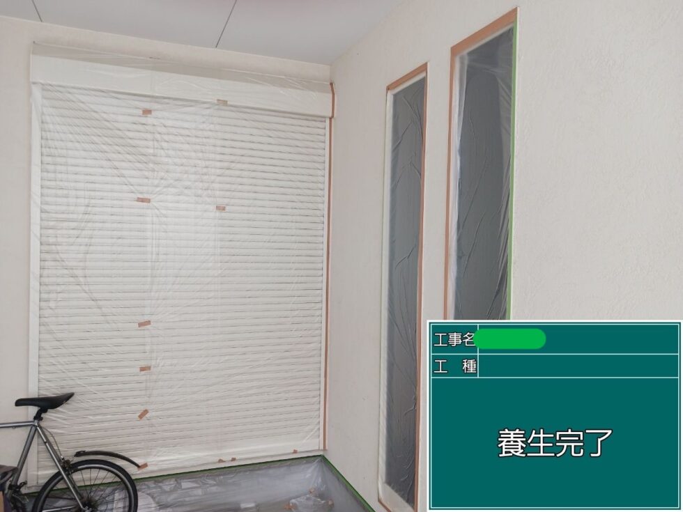 養生完了。窓や玄関まわり、土間などに塗料が付かないように養生します。仕上がりの美しさは、こうした下準備の丁寧さで決まります。
